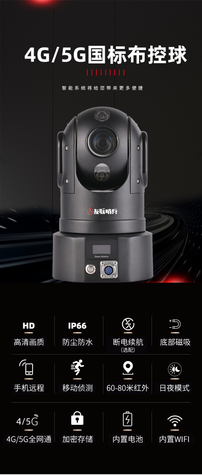 友聯哨兵無線高清國網電力雙4G智能AI布控球 黑光原彩 | 紅外夜視 友聯哨兵移動監控布控球,主要用于視頻監控、取證,采用蓄電池為主供電的模式,無線網絡傳輸,啟用流程簡單,擺脫繁瑣的選址操作 ;用戶提供高清、流暢、穩定的視頻效果,可實現存儲、傳輸、定位、對講等功能,并支持人臉車牌識別、安全生產行為分析、目標檢測AI智能視頻算法,實現多智能化管控。整機投入使用,無需拆裝,縮短工期;一次性費用投入,多場景反復使用,獲得更大投入產出比;根據項目進度更改部署位置,使用更靈活;易于擴展新功能,兼容性更強。友聯哨兵5G智能AI無線高清電網電力布控球